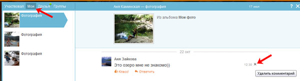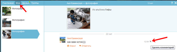 Для того щоб видалити свій коментар до фото або замітці іншого користувача, перейдіть на вкладку «Брав участь». Знаходимо зліва, наприклад, фотографію та коментар до неї, і натискаємо навпроти нього на кнопочку «Видалити коментар».