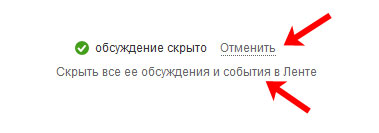 Після цього у вікні Ви побачите напис, що вибране обговорення приховано. І навіть якщо його продовжать коментувати інші користувачі, у Вашій стрічці воно більше не буде показано. Таким чином, можна видалити фото з обговорень в Однокласниках, замітки і статуси.