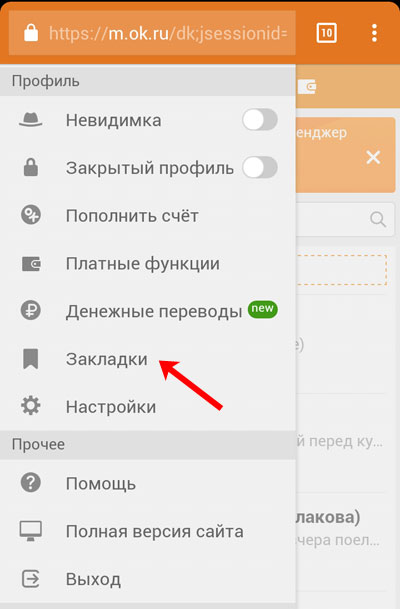Якщо Ви користуєтеся Однокласниками з мобільного телефону, тоді відкрийте браузер і перейдіть на сайт. Відкрийте бічне меню і виберіть у ньому пункт «Закладки».