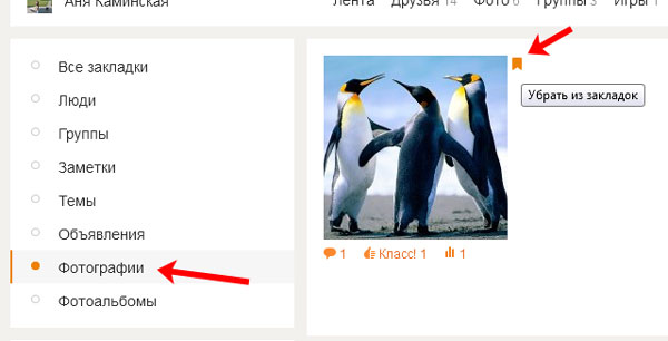 Для того щоб прибрати фото з закладок в Однокласниках, також відкрийте сторінку з закладками в своєму профілі. Потім в меню зліва клікніть по розділу «Фото». Тепер знайдіть фотографію або зображення, яке непотрібно, наведіть на нього курсив мишки і натисніть на помаранчевий прапорець у правому куті. Після цього фото буде видалено закладок.