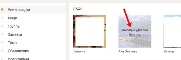 Якщо Ви помилково видалили не ту людину з закладок, то до першого оновлення сторінки браузера, у Вас є можливість його відновити. Для цього треба натиснути на кнопочку «Повернути».