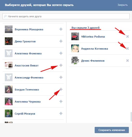 З’являється вже знайомий нам список друзів, як його формувати ви вже знаєте. Після того, як вибрати людей, які можуть бачити ваших прихованих друзів, натисніть на кнопку «Зберегти».