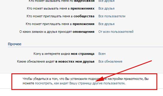 І все, що нам залишилося так це перевірити зроблені зміни. Для цього спускаємося в самий низ сторінки з налаштуваннями приватності. Знаходимо рядок «Ви можете подивитися, як бачать Вашу сторінку інші користувачі».