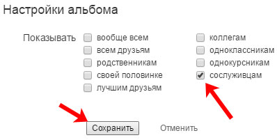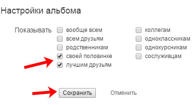 Після цього відкриється невелике віконце, в якому потрібно вибрати, які категорії ваших друзів зможуть переглядати фото з цього альбому. Поставте галочки в потрібних полях і натисніть «Зберегти».