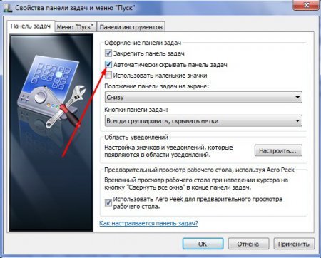 2. Далі у вікні властивостей панелі завдань і меню «Пуск» знайдіть розділ «Оформлення панелі завдань». В цьому розділі знаходиться всього 3 функції, які включаються або виключаються за допомогою прапорців. Для того щоб сховати панель завдань вам необхідно встановити прапорець навпроти команди «Автоматично приховувати панель завдань».