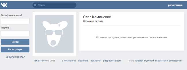 Після того, як ви поставите обмеження, що бачити вашу сторінку можуть тільки користувачі Вконтакте всі, хто там не зареєстрований будуть спостерігати перед собою ось такий екран: