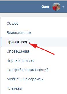 На наступному етапі у нас з’являється ще одна менюшка з правої сторони, в якій нам необхідно буде перейти в розділ «Приватність»: