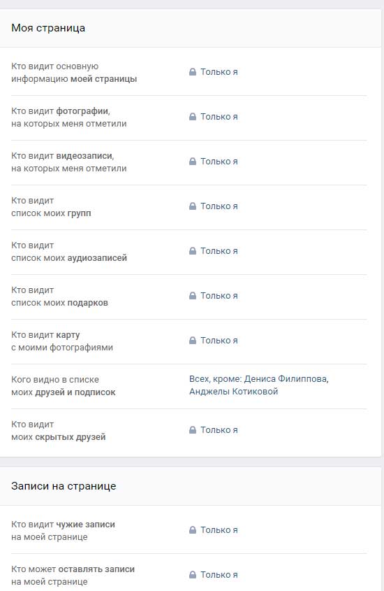 Далі у нас з’являється цілий список з пунктів. Якщо ви хочете всіх їх приховати, то навпроти кожного необхідно поставити значення «Тільки я».