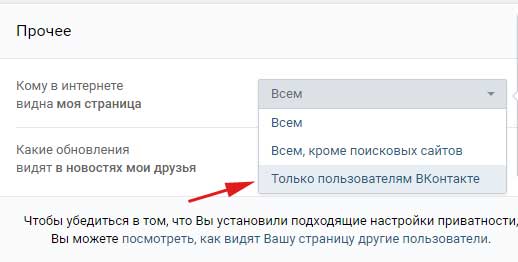 Тепер йдемо в самий кінець сторінки і знаходимо такий важливий розділ, як «Інше». Там є такий пункт, як «Кому в інтернеті видно моя сторінка». Поставте там «Лише користувачам ВКонтакте».