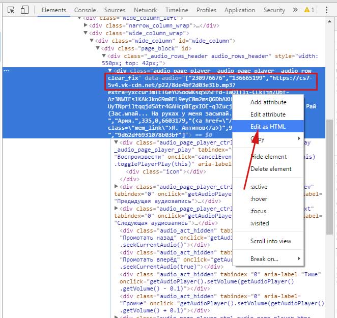 Шукаємо серед коду посилання. Вона повинна починатися з http, а закінчуватися mp3. Якщо так на око знайти не можете, то скористайтеся пошуком у браузері. Щоб його викликати, достатньо натиснути сполучення клавіш Ctrl+F. Після того, як знайшли шматок коду з посиланням на пісню, клікніть по даному шматку правою кнопкою і з випавшого меню виберіть пункт «Edit as HTML»: