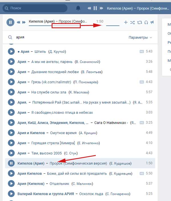 Заходимо знову в свої аудіозаписи на сторінці Вконтакті і починаємо програвати необхідну для закачування пісню. Дивимося на верхній плеєр, пісня в ньому повинна повністю подгрузиться, інакше вона не потрапить в кеш повністю: