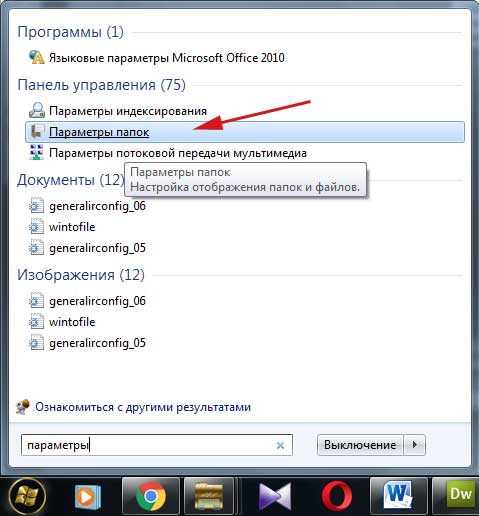 Покажу, як це робиться на прикладі Windows 7. Натискаємо на «Пуск» і в рядку пошуку пишемо «параметри папок». Тиснемо по потрібного нам результату: