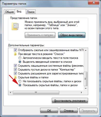 Переходимо у вкладку «Вид» у віконці, і ставимо перемикач «Показувати приховані файли, папки і диски». Тиснемо «ОК».