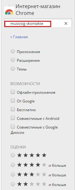 У вікні, з лівої сторони знаходимо поле для пошуку розширень і вводимо пошуковий запит «Musicsig vkontakte». Саме таке розширення нам і потрібно. Можете спробувати і інші розширення, але я тестував саме це і залишився задоволений: