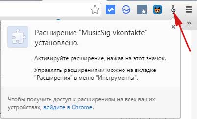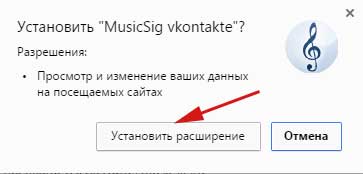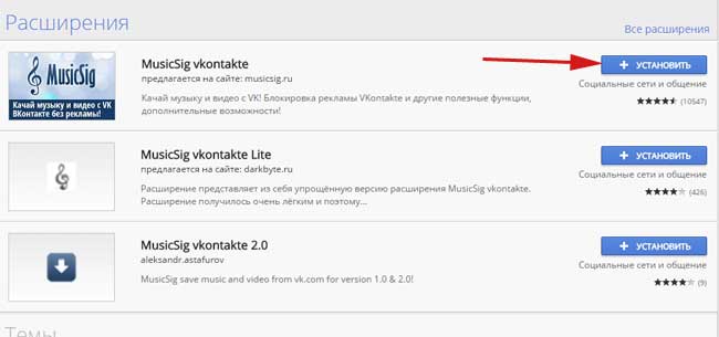 У нас є кілька розширень за даним запитом, але нам потрібно саме Musicsig vkontakte, навпроти нього ми і натискаємо на кнопочку «Встановити».