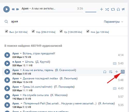 Перезапускаємо браузер Хром і заходимо в розділ «Аудіозаписи» свого облікового запису Вконтакте. Можемо ввести необхідну пісню в пошуку, а можемо пошукати серед вже завантажених ту, яка вам потрібна, і навести на неї курсор миші. При наведенні миші з правого боку навпроти пісні з’явилася дискетка. Це і є робота плагіна, який ми встановили. Для того, щоб скачати пісню, достатньо всього лише натиснути на цю дискету:
