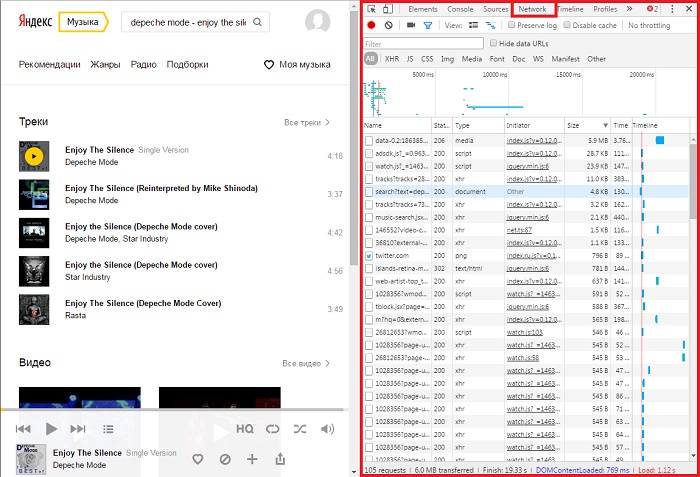 Вікно пошуку музики - Наступним кроком необхідно натиснути клавішу F12, щоб відкрити інструменти розробника у вашому браузері. Відкриється вікно, в якому необхідно знайти кнопку «Network» (мережа) і натиснути на неї. На скріні ви бачите вікно розробника і потрібна кнопка виділені червоним маркером. Якщо вікно не відкрилося, перезавантажте сторінку.