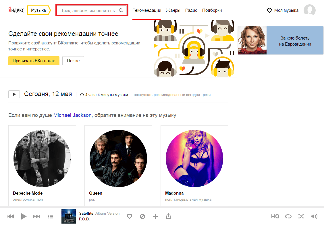 Потрапити на сервіс можна клікнувши на посилання над рядком пошуку «Музика». Музична база має, напевно, будь-який трек, як російських виконавців, так і виконавців з інших мов. Ви можете користуватися музикою, навіть якщо у вас немає облікового запису на сервісі Яндекс. Вірніше, слухати музику ви можете після того, як увійдете до сервіс як анонімний користувач і далі можете знайти потрібний вам трек для прослуховування, а для завантаження пісні з Яндекс Музика необхідно скористатися одним з методів нижче. Реєстрація дає додаткові можливості по роботі з музикою: створювати колекції, плейлисти, видаляти, додавати треки і т. д.