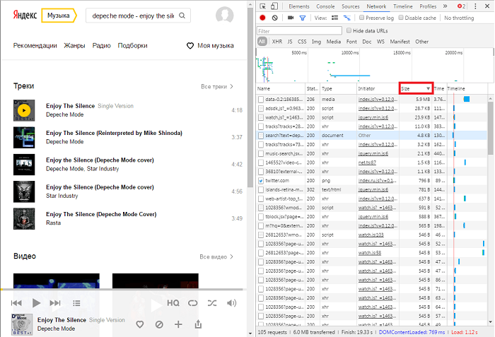 Вкладка Network на панелі розробника - Зараз натисніть кнопку «Play», щоб програти композицію. У вікні інструментів розробника вона повинна також програватися. В цьому вікні багато різних файлів, серед яких нам потрібно відшукати нашу пісню для завантаження. Вона буде мати розширення медіафайлу (mpg або інше подібне) і мати найбільшу вагу файлу серед інших. Щоб її легко відшукати натисніть на панелі сортування вкладку «Размер» або «Size», щоб найбільший файл виявився зверху першим. При цьому потрібно сторінку підняти в самий верх, інакше ви не побачите перший пункт списку.