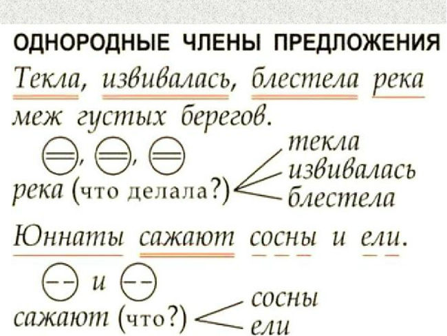 Однорідні члени на графічній схемі відображаються за допомогою гуртків. У цих гуртках зазначається їх роль в синтаксисі пропозиції: визначення, сказуемые і т. д.