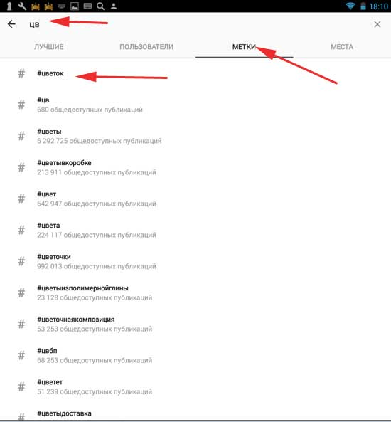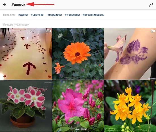 Для прикладу я вирішив знайти фотографії квітів. Я тільки почав писати (ввів перші дві букви) і система сама запропонувала можливі хештеги. Я вибрав #квітка.