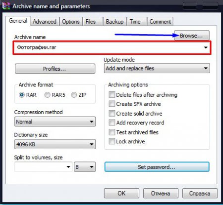 2. З’явиться вікно програми Winrar. Для початку введемо найменування майбутнього архіву (Archive name), а також місце, куди він буде збережений (для цього натисніть на кнопку «Browse»). За замовчуванням усі архіви називаються «Новий архів», а зберігаються в папку де знаходяться файли, що архівуються.
