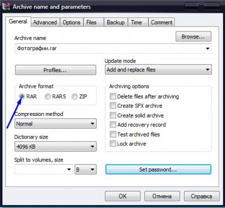 3. Далі переходимо до налаштування формату архіву (Archive format). Краще всього залишити прапорець навпроти формату «RAR», адже саме цей формат без проблем відкриється в архіваторі Winrar (та і в інших подібних програмах).