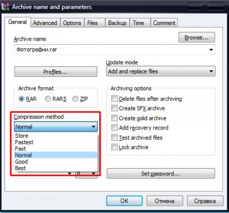 4. Тепер потрібно вибрати метод стиснення файлів. Якщо у вас важкий файл, і він не поміщається на флешку, то зжити його потрібно методом «Good» або «Best», а якщо просто фотографії, як у прикладі, то «Normal» цілком зійде. З приводу втрати якості файлу не переживайте, при архівуванні він не втрачається.