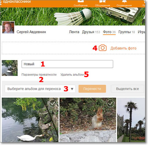 Відкриється вікно (рис. 4), в якому можна: 1 – Змінити назву альбому; 2 – Змінити налаштування приватності (кому ви дозволяєте дивитися альбом); 3 – Перенести фото в інші альбоми; 4 – Додати нові фото; 5 – Видалити альбом.