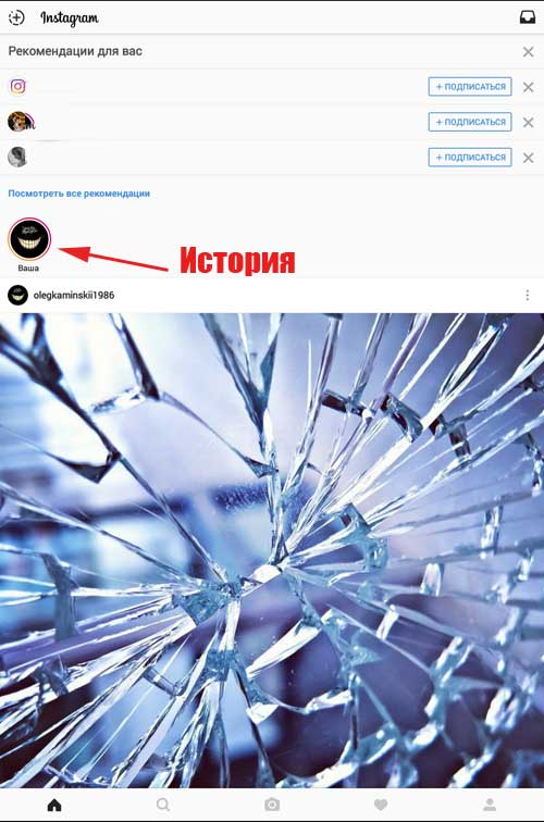 Історії ваших друзів точно також, як і ваша відображається трохи нижче рекомендацій, в самому верху. Кружечки користувачів у вигляді аватарок це і є історії. Можна спробувати натиснути на свою або чужу.