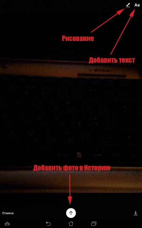 Щоб додати його в історію є біла стрілочка внизу. Однак перш ніж додавати, можна цю фотку злегка прикрасити і вставити який-небудь текст (особисто я взагалі не розумію для чого це потрібно, але все ж).