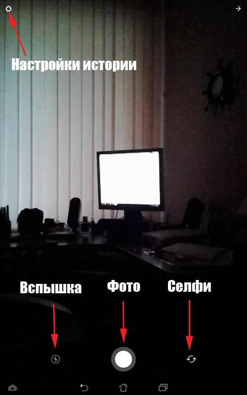 У нас відразу запускається камера. Ми можемо робити фотографії і відразу ж додавати їх в історію в режимі реального часу. Можете включити спалах або переключити камеру, щоб зробити селфи. Всі кнопочки підписані на скріншоті.