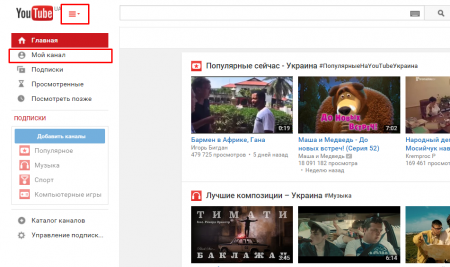 Праворуч зверху входимо в меню Ютуба і натискаємо Мій канал.