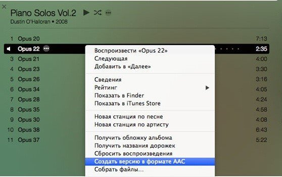 3. Слідом за тим, що ви вже зробили, потрібно вказати, що вам необхідна версія цієї пісні в такому форматі, як «AAC». Для цього знову натискаємо правою кнопкою миші на композицію, тільки тепер вибираємо пункт з назвою «Створити версію у форматі AAC». Коли операція буде виконана, утиліта подасть звуковий сигнал, який повідомляє про те, що можна перейти до наступного кроку.
