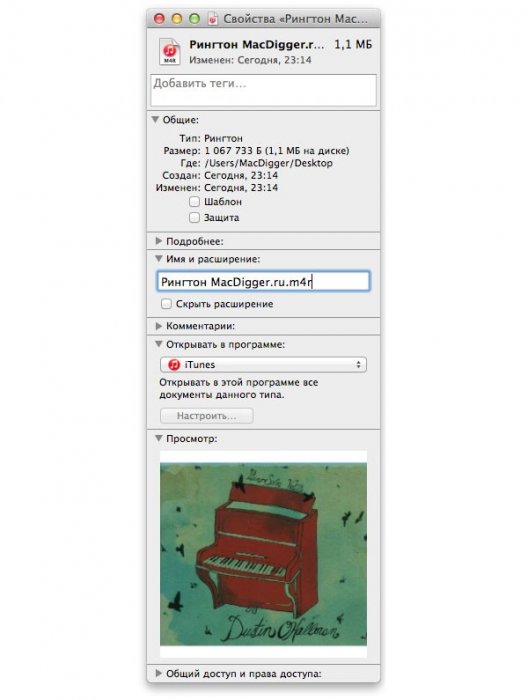 На цьому всі дії завершені, тепер ви можете спокійно встановити цю композицію на дзвінок, в настройках свого пристрою. До речі, можете видалити версію у форматі AAC з вашого телефону, щоб не займати зайвого місця на смартфоні. З створеної композицією зараз ви можете виконувати різні дії, наприклад, ви можете перейменувати, або перетягнути на зручну для вас папку.