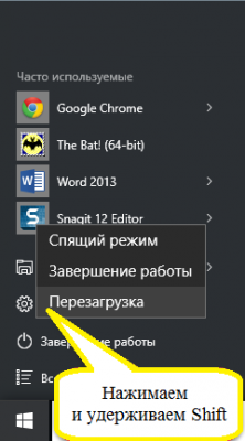 Натискаємо меню «Пуск» ? «Завершення роботи» ? «Перезавантаження» + утримуємо клавішу Shift.