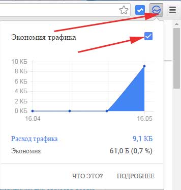 Після завершення установки у нас вискакує повідомлення про те, що розширення «Економія трафіку» встановлено, і з’являється піктограма праворуч біля меню у верхньому куті: