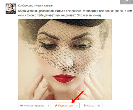Якщо вам сподобалася замітка в групі, знайдіть під нею кнопочку «Поділитися» і клацніть по ній.
