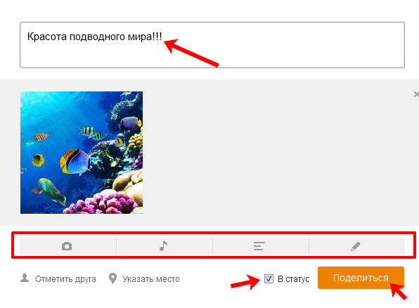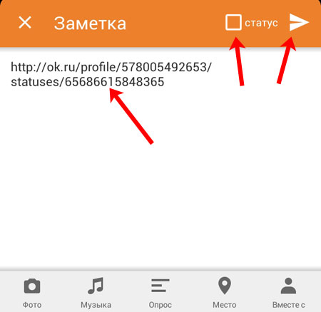 Вставте скопійоване посилання в область для тексту. Якщо хочете, щоб вона відображалася у вас в статусі, поставте галочку в полі «статус». Потім натисніть на стрілочку і дочекайтеся, коли замітка буде додано.