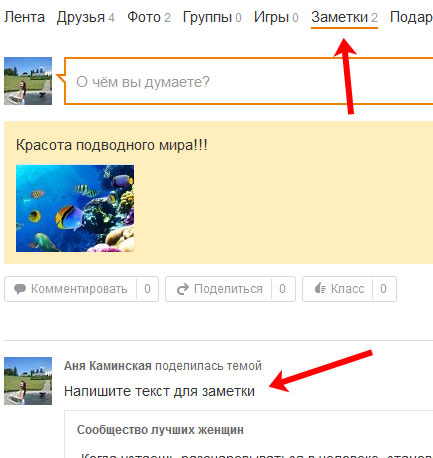 Замітки в Однокласниках дозволяють ділитися з друзями своїми думками, враженнями та іншим. Ви можете, як написати замітку самостійно, додавши до неї фото, музику, опитування, так і поділитися заміткою одного або групи в Однокласниках.