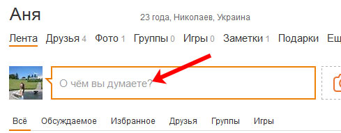 Тут розглянемо питання коротенько. Переходимо на свою сторінку в Однокласниках, і під ім’ям клікаєм в області «Про що ви думаєте?».