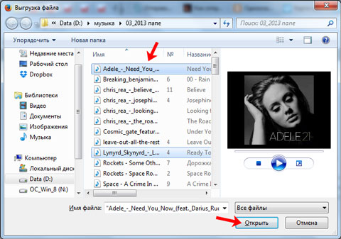 Через провідник windows, знайдіть на своєму комп’ютері пісню, яку хочете відправити другу, виділіть її мишкою і натисніть «Відкрити».