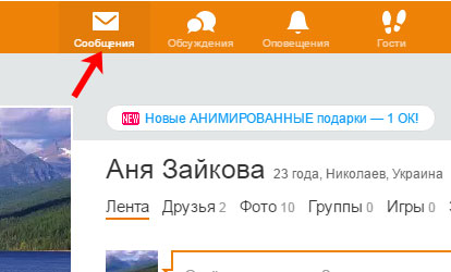 Після того, як музика в файлообмінник додана, і посилання скопійована, відкрийте свою сторінку в Однокласниках і в головному меню клікніть по кнопочці «Повідомлення».