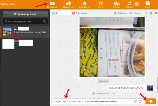 У стовпці ліворуч виберіть листування з тією людиною, з яким хочете відправити музику. Потім, в рядок введення повідомлення, вставте раніше скопійоване посилання, натисніть клавіші Ctrl+V, і відішліть повідомлення, клікнувши по кнопочці з листом.