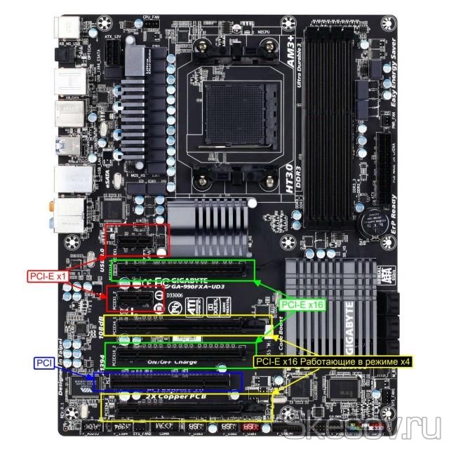 Далі роз’єми PCI і PCI-E. Тут вже все залежить від користувача, наприклад, для встановлення однієї відеокарти на даний момент підійде будь-яка материнська плата. Але от для установки двох і більше вже необхідна відповідна кількість портів PCI-E x16, притому що працюють як раз в режимі х16 або х8. Для встановлення звукової карти або мережевої карти або навіть додаткового SATA контролера так само знадобиться PCI або PCIE x1 слот. І так, якщо у вас, наприклад, звукова карта PCI-E, зовсім не обов’язково її вставляти саме в порт PCI-E x1. Якщо у вас є вільні роз’єми PCI-E x16, що працюють в будь-якому режимі (x4, x8 або x16) можна використовувати їх.