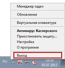 - Для початку зупинимо роботу. Для цього потрібно клікнути пр. кнопкою мишки на іконку програмки в правому кутку монітора, на панелі задач та вибрати рядок «Выход».