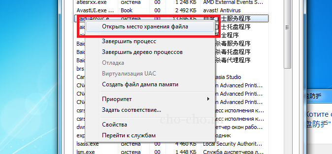 Нам потрібно дізнатися місце розташування цієї зарази на жорсткому диску, для цього натискаємо на кожен процес правою кнопкою миші і вибираємо «Відкрити місце зберігання файлу».