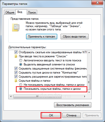 Переходимо до ручного видалення, для цього нам потрібно, щоб всі системні і приховані файли відображалися в папках. Для цього відкриваємо будь-яку папку, натискаємо Alt, потім переходимо в Сервіс — властивості папки — Вид і ставимо галочку навпроти пункту «Показувати приховані файли і папки«, як показано на скріні нижче.
