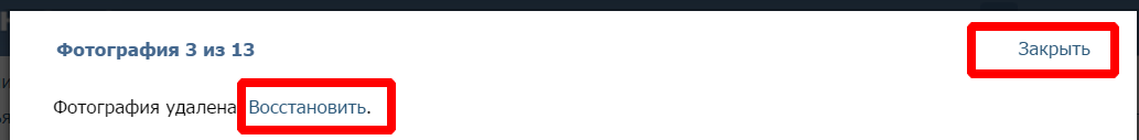 Внизу буде посилання «Видалити», необхідно натиснути на неї і закрити вікно із зображенням, клацнувши на посилання «Закрити» праворуч, вгорі віконця. Далі, вийти з розділу з фото.