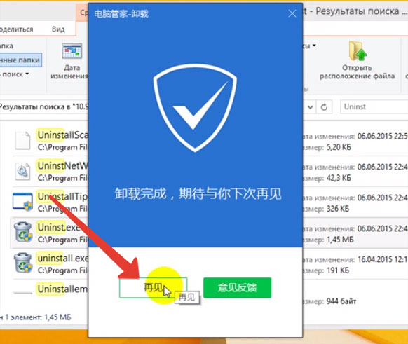 Після запуску дєїнсталлятора з’явиться зображення синього щита з масою китайських ієрогліфів. Для продовження видалення Tencent QQ PC Manager необхідно натиснути на білу кнопку ліворуч, потім на червону кнопку ліворуч, потім на білу кнопку зліва і після закінчення видалення знову тиснемо на білу кнопку зліва. Після видалення антивірусу китайського походження обов’язково перезавантажте комп’ютер.